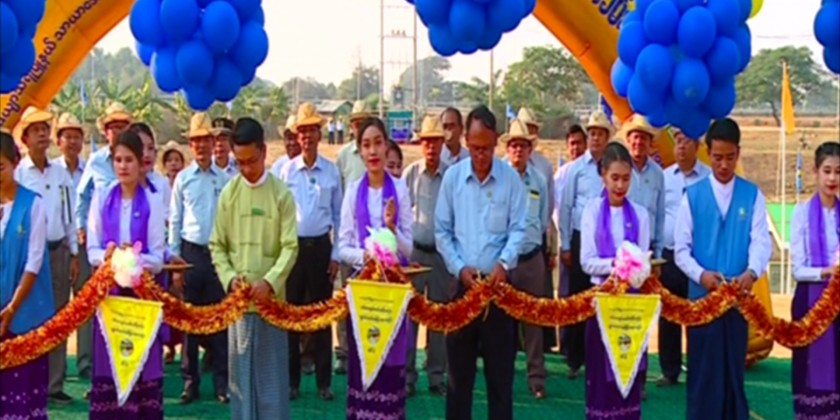 Next, the chairman of district administration council, assistant director from Irrigation and Water Utilization Management Department and two farmer representatives opened the ceremony by cutting the ceremonial ribbon and the deputy minister Dr. Aung Gyi and member of Nay Pyi Taw Council Col. Min Naung launched the water distribution by pressing the button of water pumping and water sprinkling.