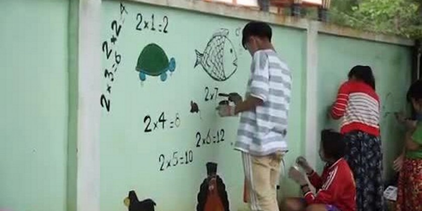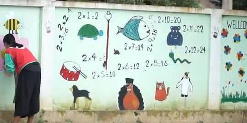Led by the School Welfare Committee, the activity of drawing poems, multiplications and teaching aid illustrations were carried out on the inside wall of the school compound.