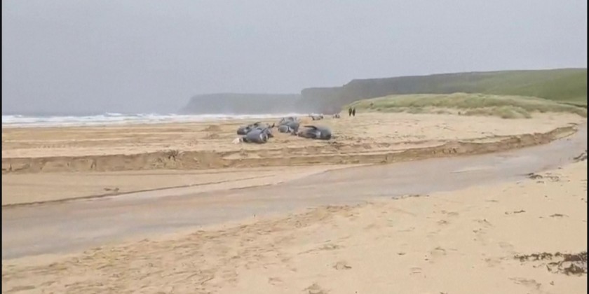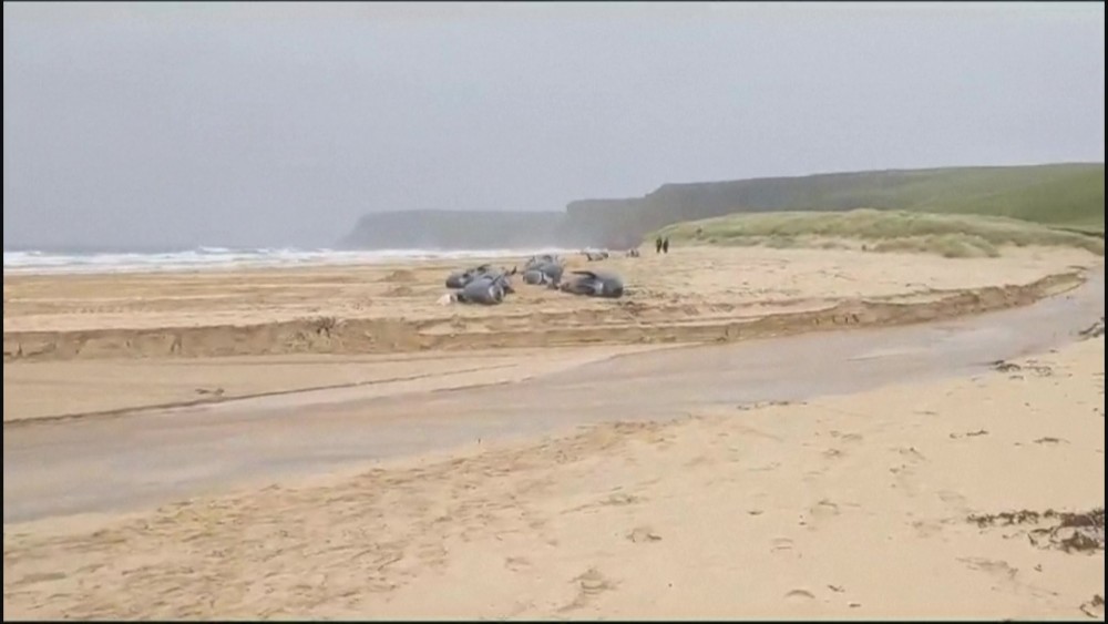 Around 55 pilot whales have died in a mass pilot whale stranding on a beach off the west coast of Scotland. Eight adults and four calves who were still alive had to be euthanized.