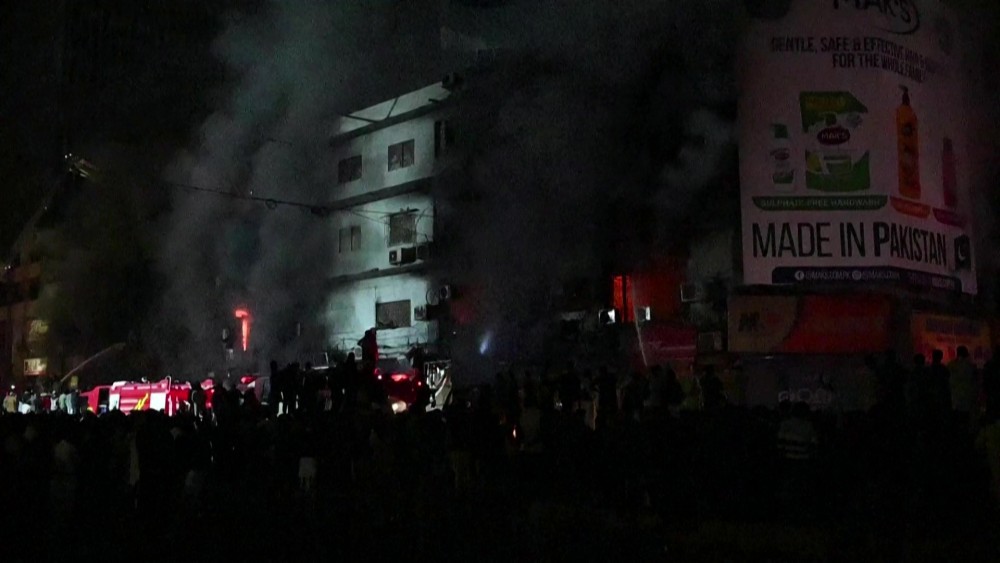A fire at a shopping center in Pakistan has killed at least three people and injured several others. Thick plumes of smoke billow from the windows as firefighters work on site after a fire ripped through a shopping mall. The blaze swept through the multi-storey Gul Plaza in Karachi city on Saturday, officials said.
