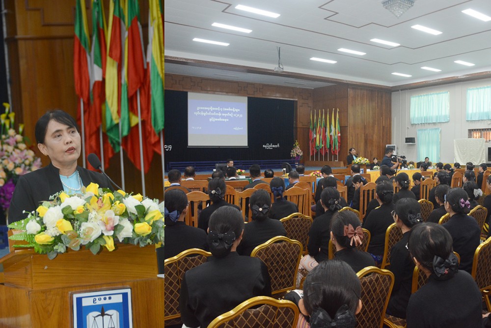 Speaking on the occasion, Union Minister for Legal Affairs, Union Attorney General Dr.Thida Oo said that this training course is conducted to selected new law officers in accordance with the the Attorney General By-laws, aiming to understand rules and regulations of civil service personnal and codes of ethic of law officers while learning legal subjects.