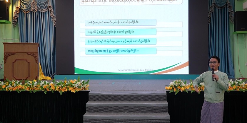 Following this, the Director of DICA, U Tun Tauk Aung , gave a presentation using PowerPoint on the legal concepts of Myanmar companies, rules and regulations, basic knowledge required when forming a company, and principles of company ownership and management.