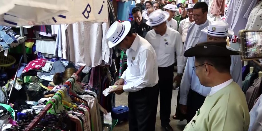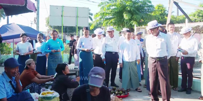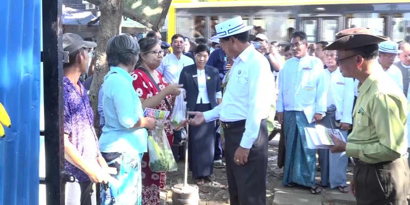 Then, the Chief Minister and party inspected the preparations carried out at polling booths No.1 and 2 at No.2 Basic Education Middle School in Dawbon Township and gave necessary instructions. Next, the Chief Minister and party proceeded to Pazuntaung Market in Pazuntaung Township and NandaWun Market in South Okkalapa Township, and distributed pamphlets to commuters, vehicles and citizens.