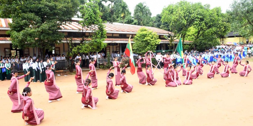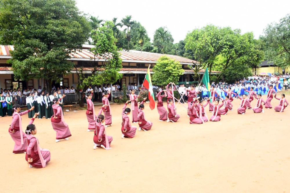Following this, students from BEHS No. (8), Pyinnya Yaung Chi Private High School, and Training Middle School performed songs, while Drum and Bugle band and a Pom Pom dance group provided musical and dance entertainment. The Chief Minister and officials watched the performances with support, and the Region Government awarded cash of honor.