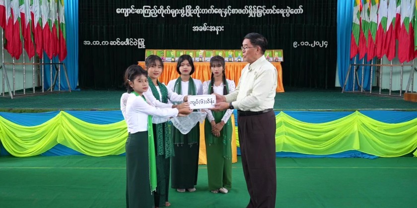 Then, the Chief Minister presented gifts to the author U Set Aung who participated in knowledge sharing session, donated publications for the school library, presented honorary cash awards to the students.