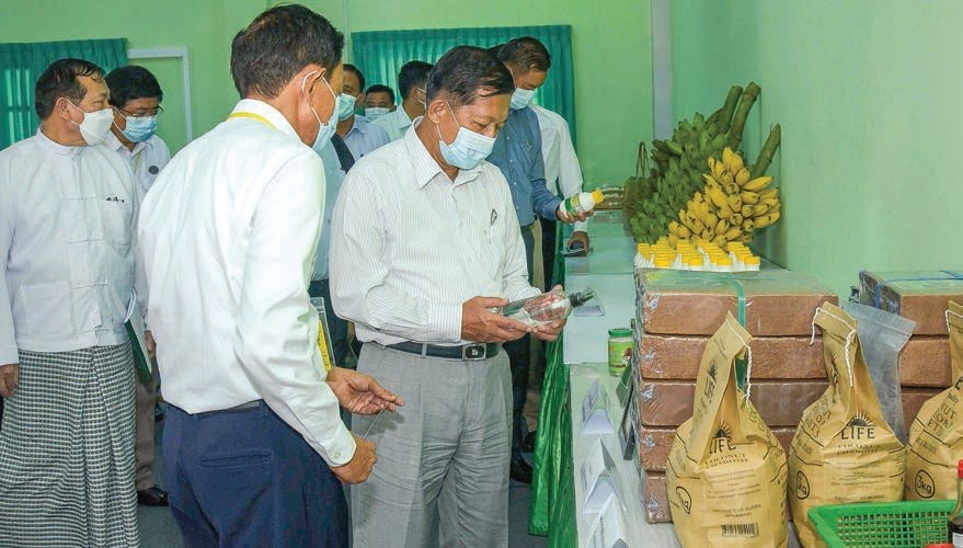 The Senior General also inspected the sample fish, duck eggs, Taiwan papaya species, jade Phigyan banana species, dairy products and coconut products and later viewed the fish farming and duck farming.