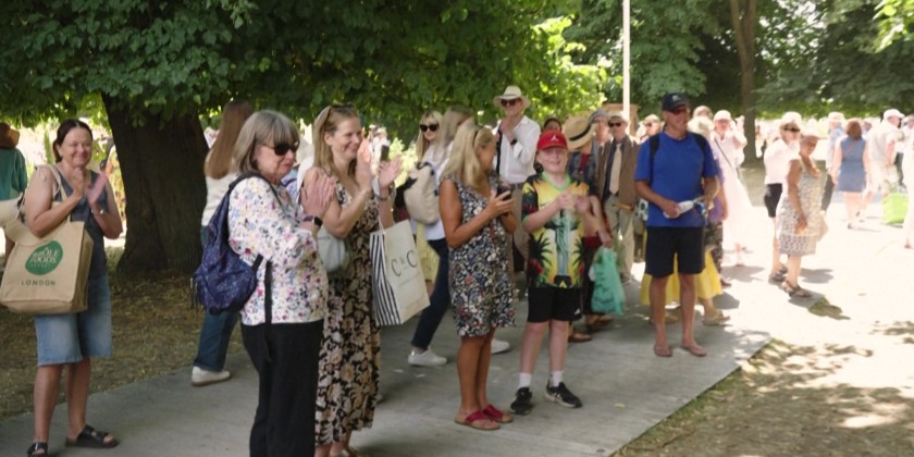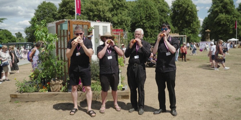 The London Vegetable Orchestra performs at the RHS Hampton Court Palace Garden Festival in London, surprising bystanders with instruments carved from vegetables and fruits.