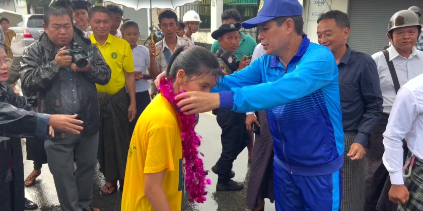 During the ceremony, Chief Minister U Myo Swe Win delivered an opening address. He then presented medals and cash prizes to the first, second, and third-place winners of the men's long-distance race. Following this, the Chief Justice of Region High Court and region ministers awarded medals and cash prizes to the top three female runners and to those who finished in places 4 through 30. The Chairperson of the Bago Region Women's Affairs Committee awarded medals and cash prizes to the first, second, and third-place winners of the International Youth Day essay and article competitions. Finally, the Region Advocate General presented honorary awards to the participants of the International Youth Day youth dialogue.