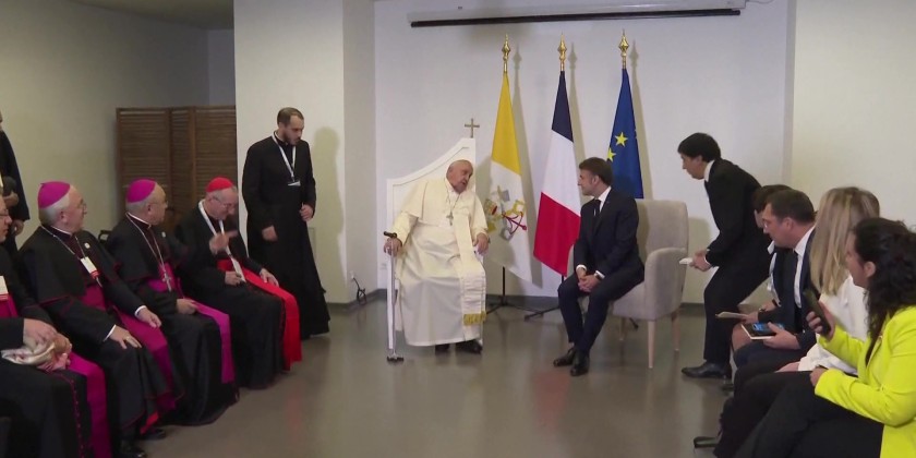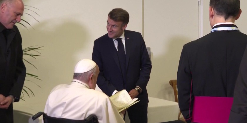 French President Emmanuel Macron met with Pope Francis at the Napoleon Bonaparte airport in Ajaccio on Sunday, marking the end of the pontiff’s visit to Corsica.