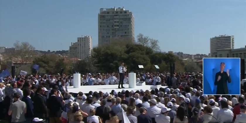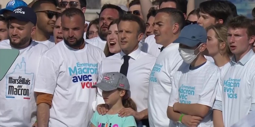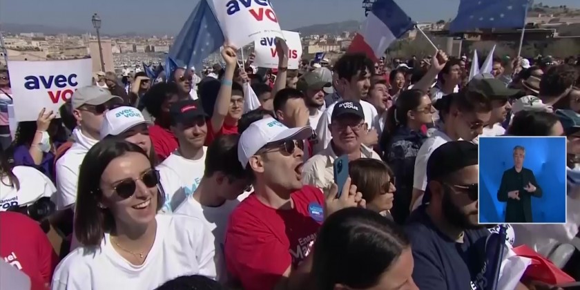French President Emmanuel Macron held a major campaign rally on Saturday in Marseille, touting his environmental and climate actions and plans in a bid to draw in young voters who supported more politically extreme candidates in the first round of France's presidential election.
