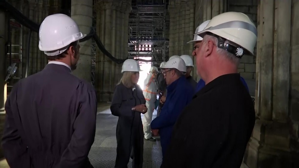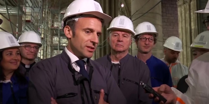 Macron toured the site where works are being carried out to restore the iconic landmark and spoke to those undertaking the project about their progress so far.