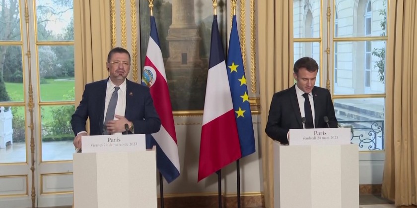French President Emmanuel Macron welcomed Costa Rica President Rodrigo Chaves Robles on Friday at the Elysee in Paris. The two leaders are scheduled to discuss matters of bilateral cooperation, with the environment and climate as issues on top of the agenda.