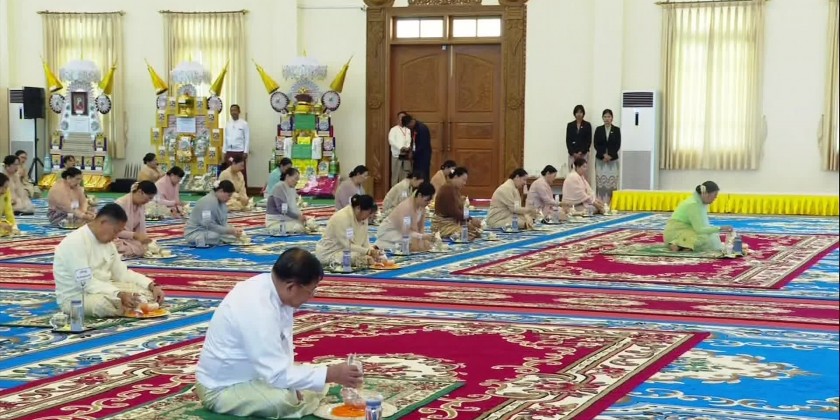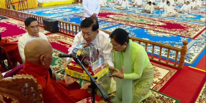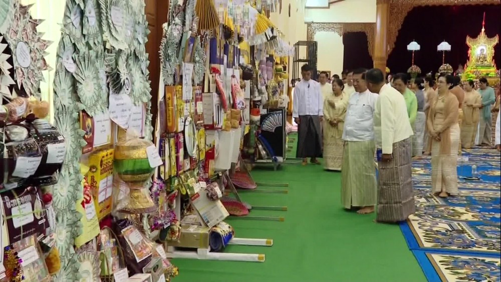 Chairman of the State Administration Council Prime Minister Senior General Min Aung Hlaing and wife Daw Kyu Kyu Hla attended the 2024 Kathina robe offering ceremony of the State Administration Council of the Republic of the Union of Myanmar at Sasana Maha Beikman in the precinct of Uppatasanti Pagoda in Nay Pyi Taw and offered Kathina robes and alms to members of the Sangha in the morning on November 11.