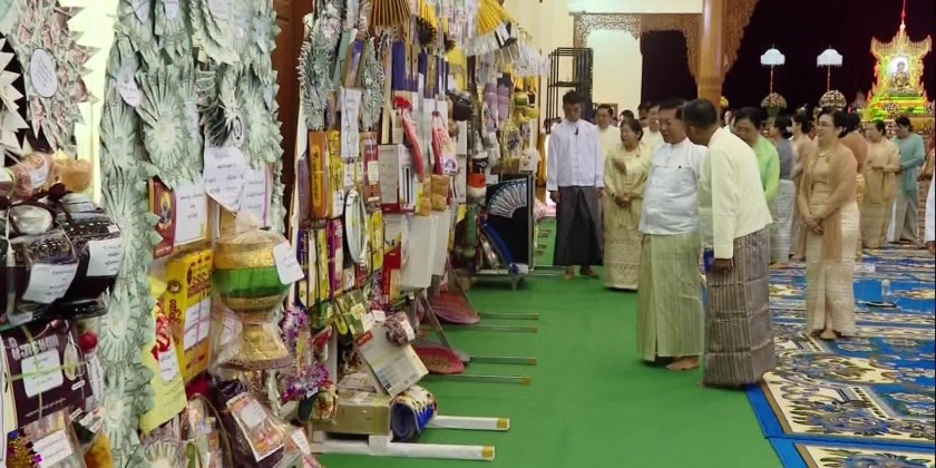 First, the Senior General paid homage to the Buddha image in the Sasana Maha Beikman and offered the alms in the emerald alms-bowl, flowers, water, oil lights and fruits.The Senior General and congregation viewed round the display of Kathina robes, offertories and offertory trees to be donated to Vajurananda Thubawdayon Monastery in Uttarathiri Township of Nay Pyi Taw.