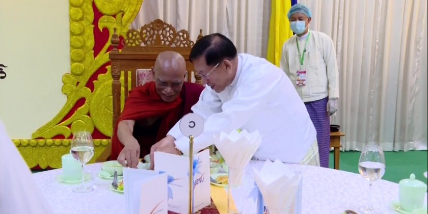 The Senior General and congregation listened to a sermon delivered by Rector Sayadawgyi and shared merits gained.After the ceremony, the Senior General, wife and congregation offered day meals to the members of Sangha led by Thanlyin Minkyaung Sayadaw.