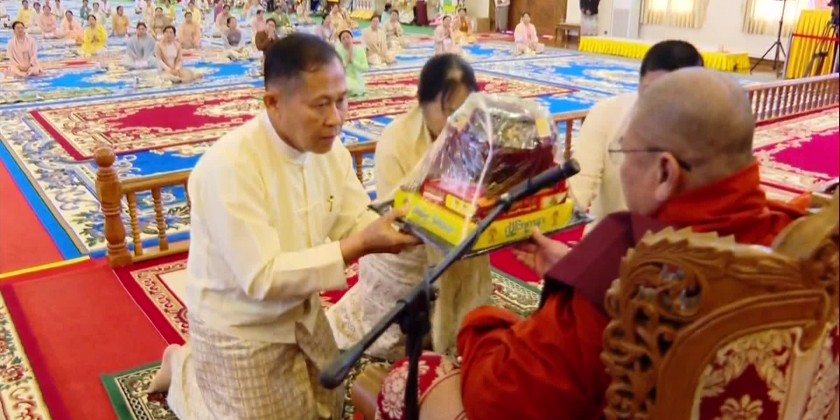 After opening the ceremony, the Senior General and congregation took the Five Precepts from Thanlyin Minkyaung Sayadawgyi and listened to recitation of Metta Sutta by members of the Sangha.The Senior General and wife donated Kathina robes and offertories to Thanlyin Minkyaung Sayadaw, Vajurananda Thubawdayon MonasteryRector Sayadawgyi respectively.
