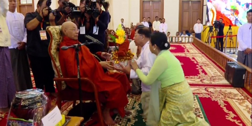 Present at the ceremony were 27 members of the Sangha led by the Chairman Sayadaw of the State Sangha Maha Nayaka Committee Presiding Patron of Thanlyin Minkyaung Pahtamabyan Sarthintaik Dr Bhaddanta Candima Bhivamsa, Secretary of the SSMNC Mahanayaka of Masoeyein Taikthit Presiding Sayadaw of Dhammasamiddhi monastery Baddanta Vasethabhivamsa, Vice Chair of Shwekyin Nikaya Joint-Sangharaja of Shwekyin Sect, Mahanayaka of Mahathubawdayon monasteries, Rector Sayadawgyi Dr. Baddhata Nandamalabhivamsa, Ovadacariya Sayadaws of the Uppatasanti Pagoda Board of Trustees.