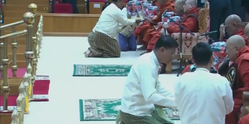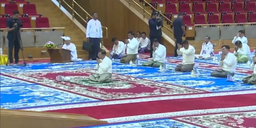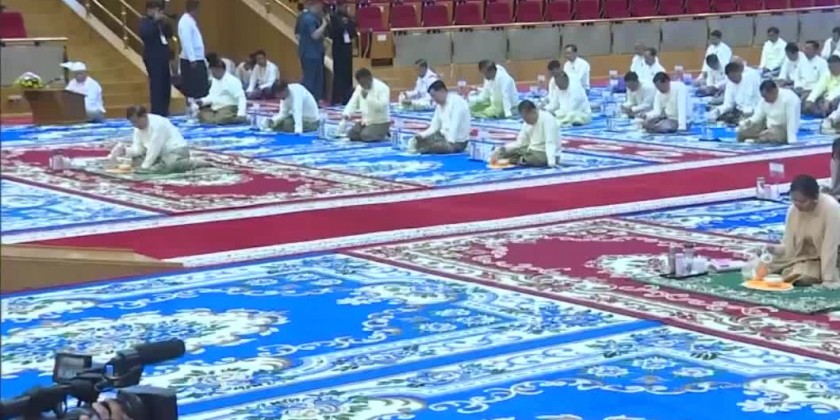 After the opening ceremony, the congregation led by the Chairman of State Administration Council Prime Minister observed the five precepts administered by the Chairman of State Sangha Mahanayaka Committee, Presiding Sayadaw of Thanlyin Township Min KyaungPahtamapyanSarthintaik AggamahapanditaAggamahasaddhammajotikadhaja Dr. BaddantaCandimabhivamsa. Then, the congregation took the Metta Paritta Sutta recited by the members of Sangha.