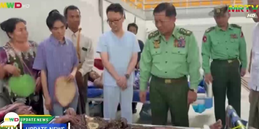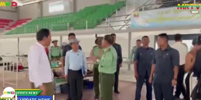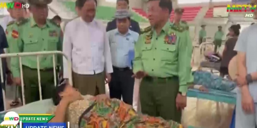 Next, the SAC Chairman comforted the patients injured during the earthquake who are undergoing medical treatment at the temporary hospital opened by the Ministry of Health in the indoor stadium individually. During the inspection, the SAC Chairman instructed the responsible officials to carry out for the convenience of the water and electricity for the patients and family members, deploy the Tatmadaw medical team with the mobile operation vehicle and to provide the accommodation for the medical teams from other countries and work together with them in providing medical treatment.
