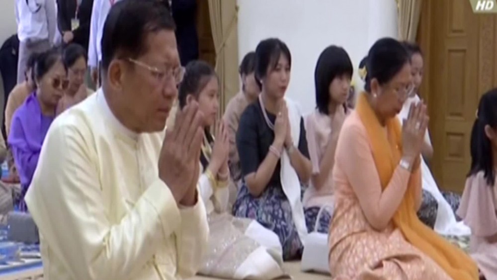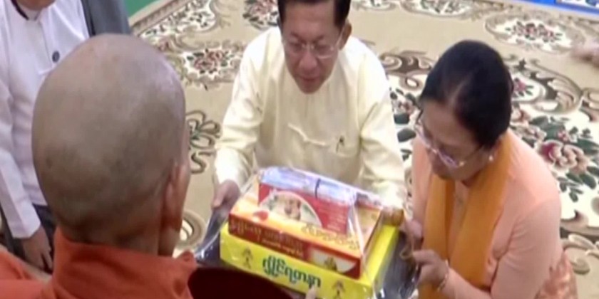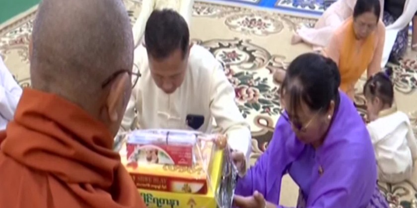 Then, the Prime Minister, wife and families offered the documents related to the monastery to the Presiding Sayadaw. This was followed by donation of offertories to the Sayadaws by the Prime Minister and wife, Vice Chairman of the State Administration Council Deputy Prime Minister Vice Senior General Soe Win and wife.