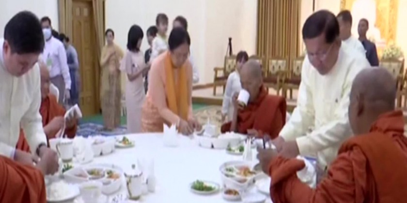The congregation later shared the merits gained and the ceremony concluded. After the ceremony, the Prime Minister and party offered day meal to the Sayadaws.