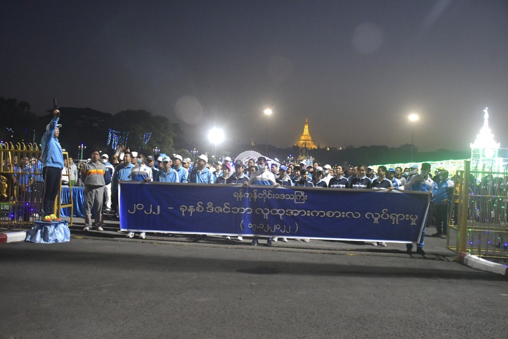 First, the mass walk gathered at Peoples’ square and Garden in Dagon Township at 6 AM and they started walking along the Pyay Road, turned at Shin Saw Pu Street, Shwedagon Pagoda west gate through U Wisara Road after passing Taw Hlan Yay Park (Yangon) and entered People’s Square and Garden through east entrance. At People’s Square, they did the collective physical exercises, it’s reported.
