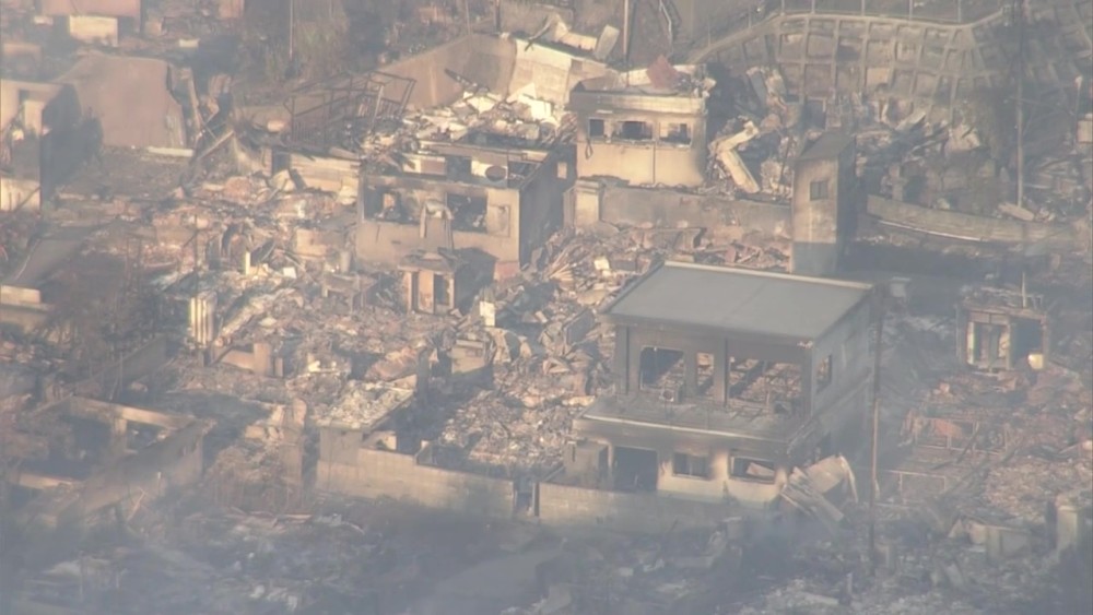 Firefighters have been battling an extensive fire in Oita Prefecture, southwestern Japan. Prefectural authorities said more than 170 houses and other buildings have been burned and a man in his 70s has been unaccounted for.