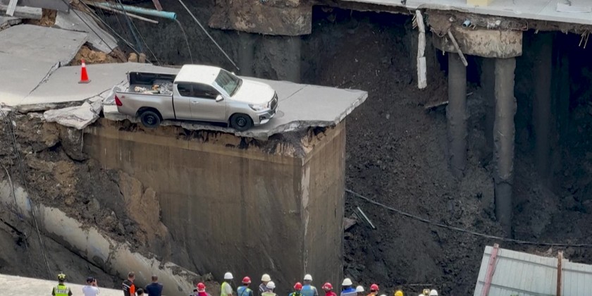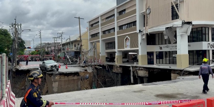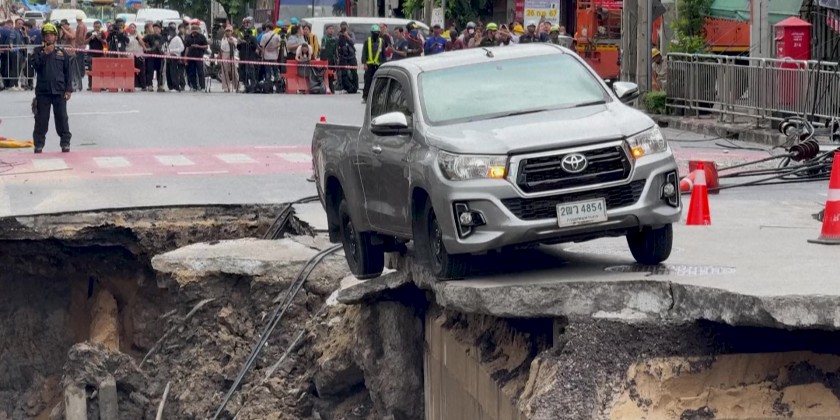 Just outside a local police station and Vajira Hospital in a residential district of Bangkok, a roughly 50-meter hole pulled down power lines and exposed a burst pipe gushing water. Dozens of police and city officials cordoned off the site, while a pickup truck teetered precariously on the edge of the hole. Director of Bangkok's disaster prevention department told at the scene that the collapse was likely linked to recent heavy rain and a leaky pipe.
