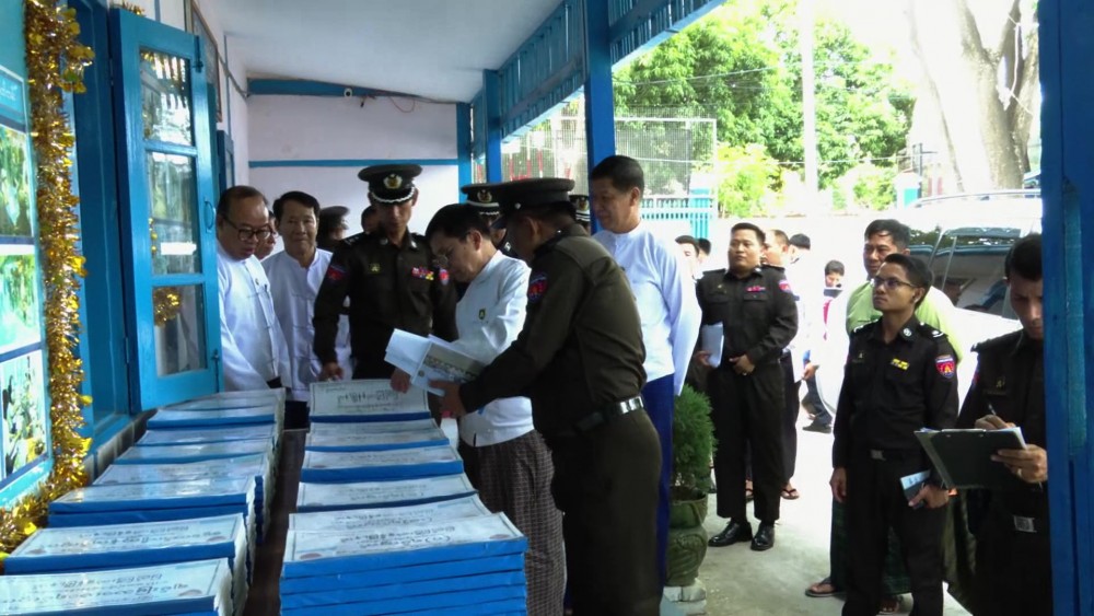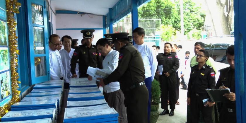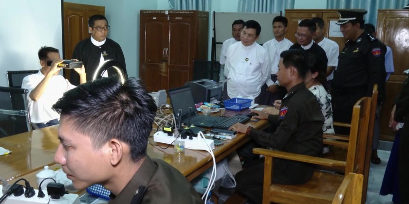 Chairman of e-ID System Working Committee Union Minister U Myint Kyaing together with Mandalay Region Chief Minister U Myo Aung and officials visited Pyigyi Tagun Township staff officer office in Mandalay region on 4th July to inspect keeping statistical records that were collected by making field trips in the township, computerizing the lists, scrutinizing the facts with that from e-ID server in Nay Pyi Taw (Head-office) and systematic keeping of issuing national registration cards and officials reported on progress of works.