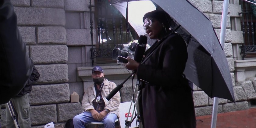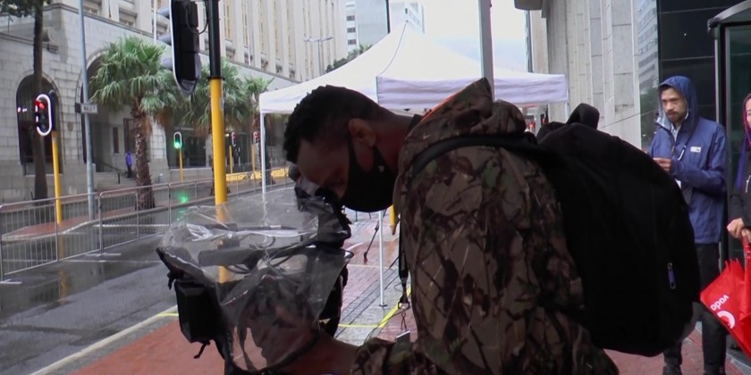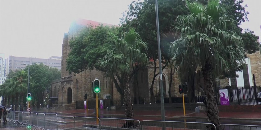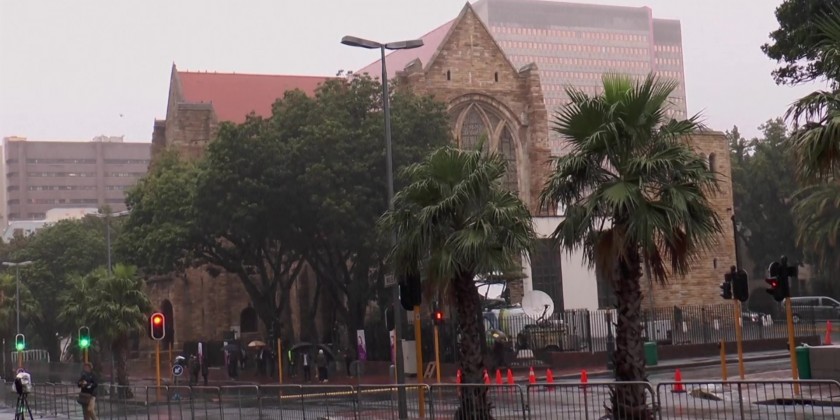 Members of the media set up outside St. George's Cathedral in Cape Town early Saturday, ahead of the funeral of South Africa's late Archbishop Emeritus Desmond Tutu.