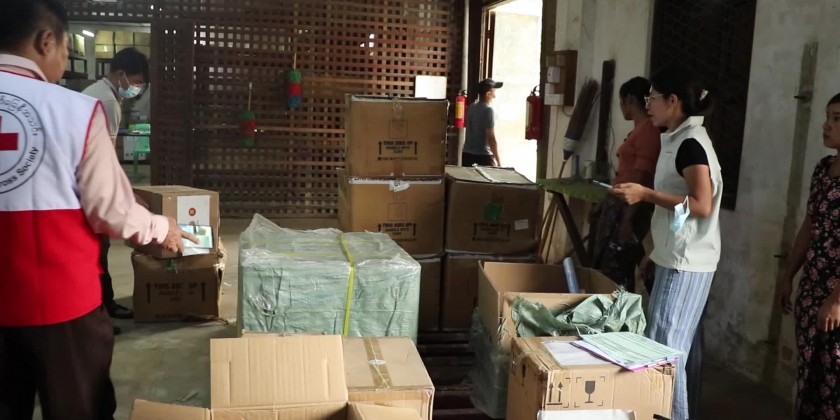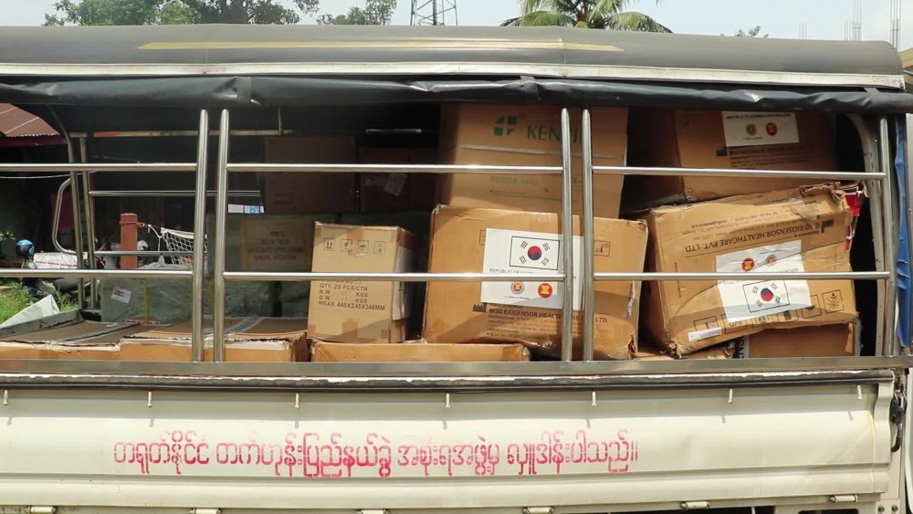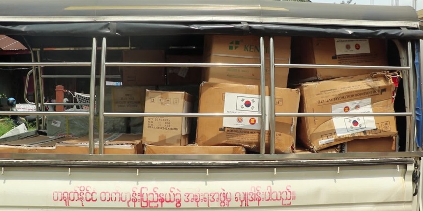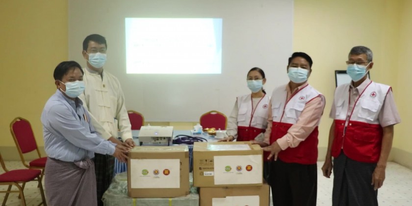 The AHA Centre donated 10,000 RDT Test Kits, 2 oxygen pipes, 1,000 drip sets and infusion sets, 150 thermometers, one ECG machine and 45 digital BP measuring devices. The donated items will be distributed to Mohnyin, Waingmaw and Puta-O People’s Hospitals.