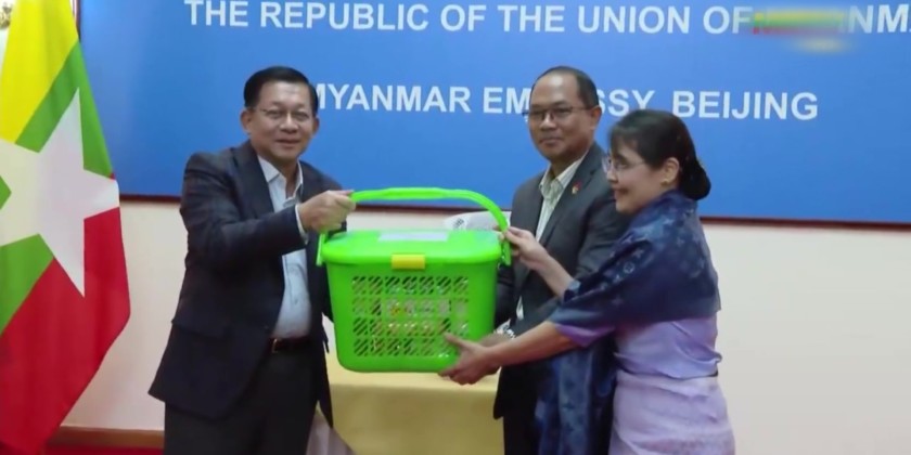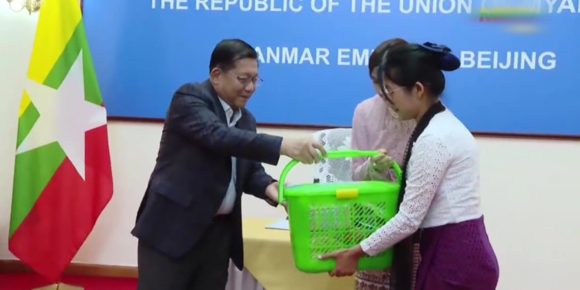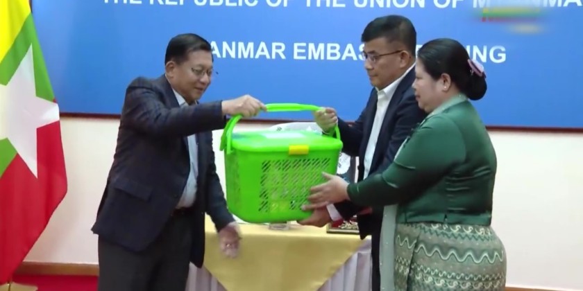 These were accepted by the Ambassador and his spouse, military attachés (Army, Navy, and Air) and his spouse, along with embassy families and students. Later, the Acting President and SSPC Chairman signed the Guest of Honour Book of the Embassy of Myanmar in Beijing and cordially greeted embassy and military attaché office families.