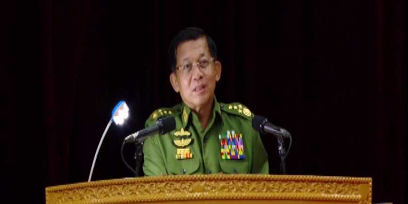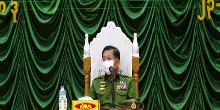 State Administration Council Chairman Commander-in-Chief of Defence Services Senior General Min Aung Hlaing addresses the meeting with commandants, senior officer instructors and lecturers of the Defence Services Medical Academy, the Defence Services Institute of Nursing and Paramedical Science and the Defence Services (Army) Officers Training School (Hmawby) at the Convocation Hall of the DSMA in Mingaladon Station of Yangon Region on Thursday.