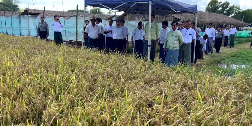 He also visited Letkhokkwin village, where 10,000 native chickens and 5,000 ducks are being raised, along with fishponds for animal feed production. Afterwards, he inspected a successful pilot paddy plantation on previously uncultivable sandy soil in Katote Phaya Gyi village-tract, noting an impressive yield of 110 baskets per acre, and instructed officials to expand the variety to similar farmlands across the township.