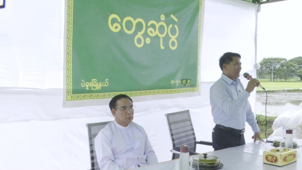 On the evening of July 8, Union Minister for Agriculture, Livestock and Irrigation, U Min Naung, along with Bago Region Chief Minister U Myo Swe Win, met with local farmers at the monsoon paddy field in Katwin Chan Village, Bago Township. They discussed achieving target yields for monsoon paddy and other main crops, as well as expanding the cultivation of successive crops.