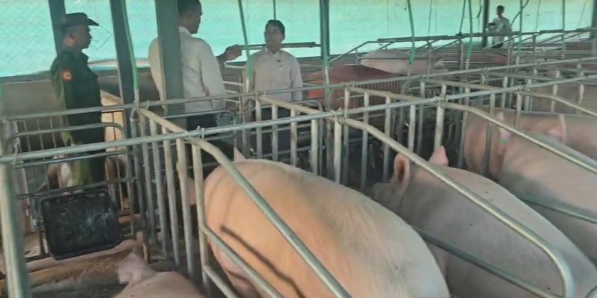 Subsequently, the Union Minister visited the Model Pig Farm in Yaynikan Village, Loikaw Township, being implemented under the state government's management. The responsible person explained the raising of meat pigs, breeding pig farming supported by the country’s economic promotion fund, and the provision of pig farming technology to local breeders. The Union Minister then inspected the farm. Regarding the presentations, the Union Minister provided guidance on the necessary actions.