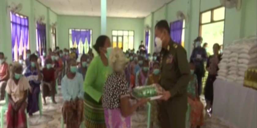 In Salonkyun Village on Zadetgyi Island, the Vice-Senior General presented nutritious foods for older Salon persons and rice and foodstuff for Salon families.