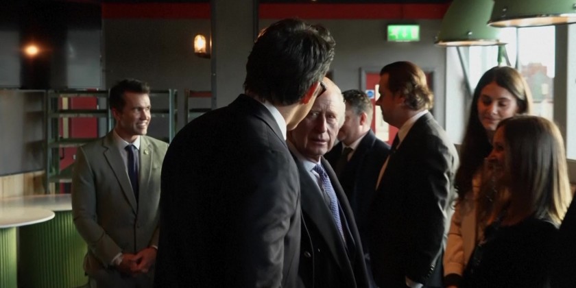 King Charles III met the owners of Wrexham A.F.C. Friday - Ryan Reynolds and Rob McElhenney along with participants from Powerchair football, a team sport for electric wheelchair-users.The Hollywood actors spoke with the king and Queen Consort on the pitch before introducing them to the soccer team and posing for photographs.
