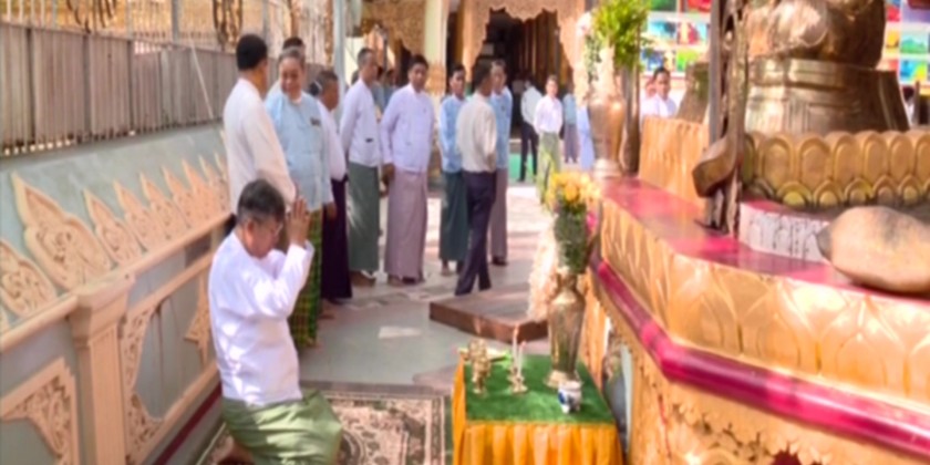Union Minister for Religious Affairs and Culture U Tin Oo Lwin together with the officials offered water, flowers to the Buddha Image under the Bodhi tree at the south entrance of the Shwedagon Pagoda and paid homage to the Padamya MyetShin Buddha image at upper terrace in the morning on 12th November.