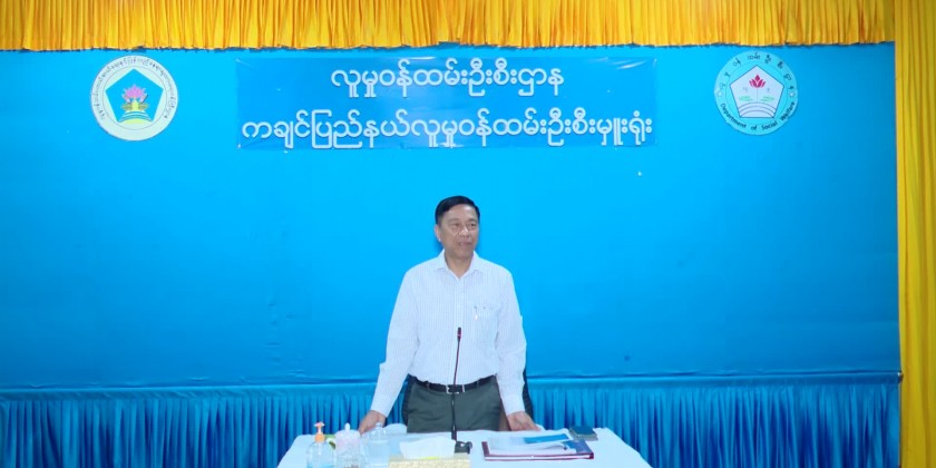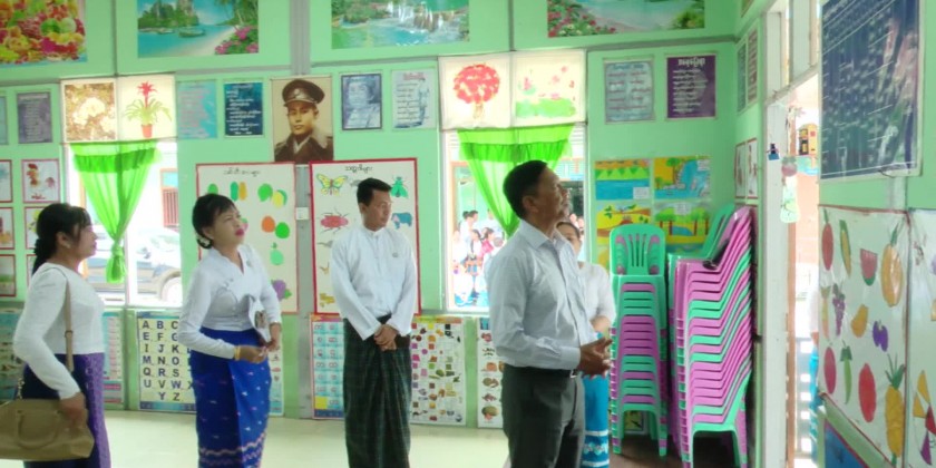 Next, the Union Minister visited No (1) Pre-School in Myitkyina Township, oversaw the status of providing teaching aid materials for the children, class rooms, dining rooms for the children, kitchen and play ground and gave necessary instruction.