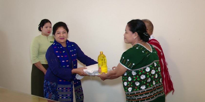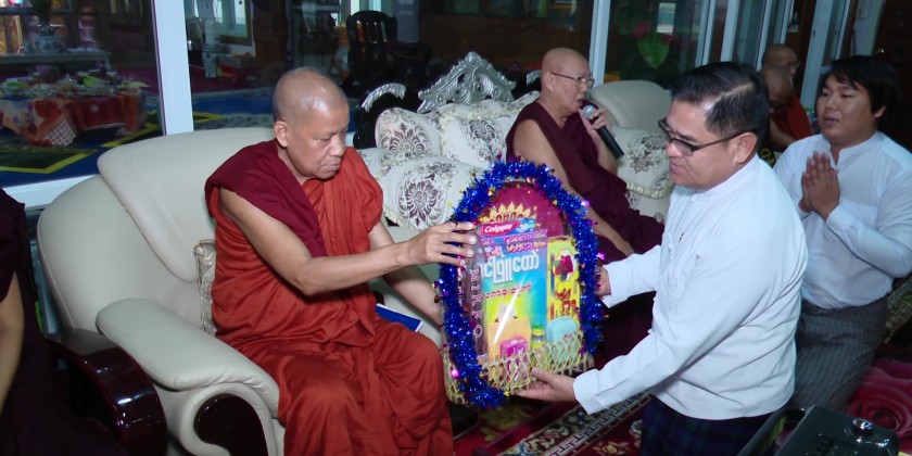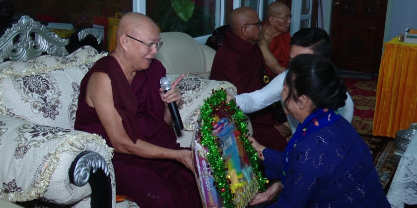 First, the SAC member Daw Doi Bu, Chief Minister U Khet Htein Nan and wife, State Minister for ethnic affairs and officials visited Thirimingalar Kan Oo Sarthintaik, paid homage to the Sangha led by the presiding Baddanta Kesava, offered 15 bags of rice, 5 tins of cooking oil and cash assistance, shared the merits gained and supplicated religious matters.