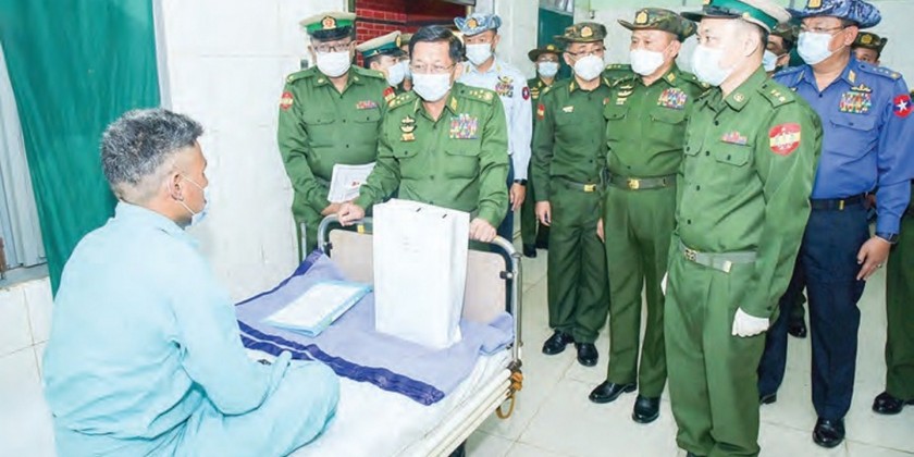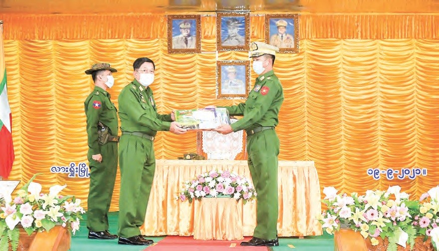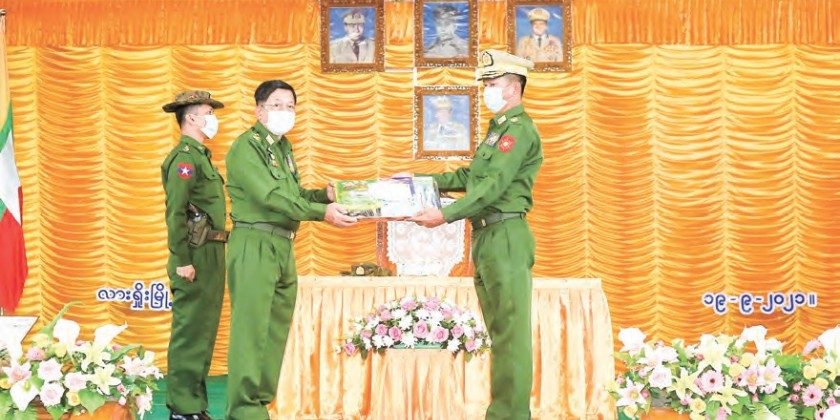 When the outbreak declines significantly and can be put under well control, education promotion measures will resume. Energetic efforts are being made for vaccinations, and it has been targeted to vaccinate up to 50 per cent of the population by this year end, said the Senior General. Later, the Senior General and wife and party proceeded to the local military hospital in Lashio where he greeted the officers and other ranks receiving treatment, comforted them and presented foodstuffs.