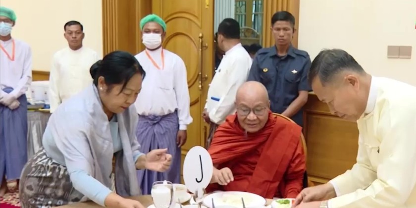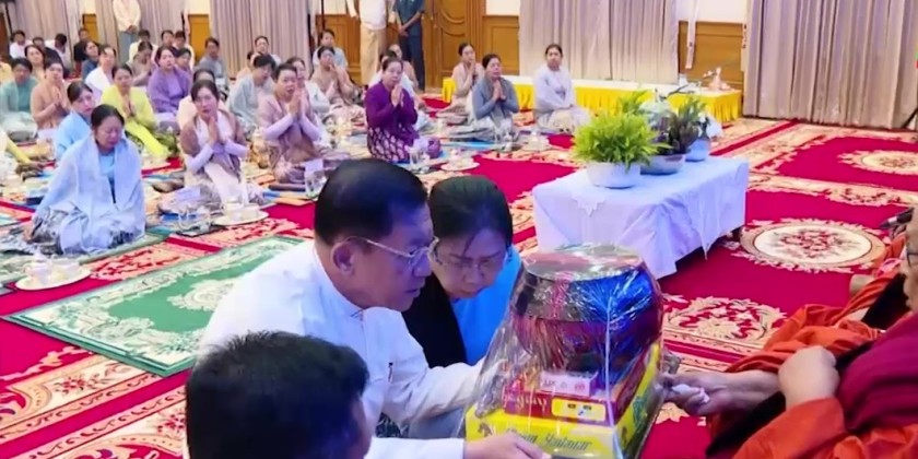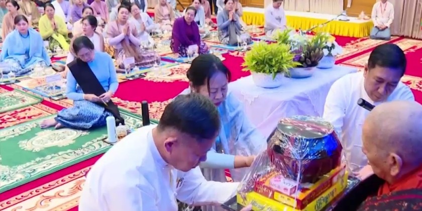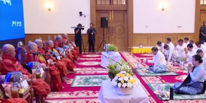 Later, the Prime Minister and his wife, along with the attendees, listened to a Dhamma discourse delivered by the Sayadaw of Mingalar Zayyon Monastery Pali Takkatho Agga Maha Pandita, Agga Maha Saddhamma Jotika Dhaja Bhaddanta Vimalabuddhi and shared the merits gained dedicating to the the members of Sangha, nuns, and civilians who lost their lives in the Mandalay earthquake.