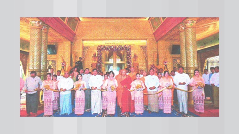 First, the Abbot and responsible persons from the Lingguang Temple cut the ribbon to open the newly installed security glass at the entrance and exit of the Hair Relic Chamber and the polycarbonate glass on the surrounding golden walls, and sprinkled scented water. Following this, the Abbot of the Lingguang delivered words of joy and appreciation and donated 10,000 Yuan for the construction of a new treasury at the Botahtaung Pagoda. The Deputy Minister accepted the donation and distributed the merits of all donations by pouring libation water.