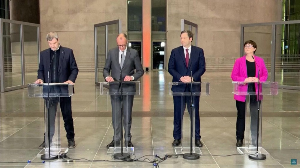 Merz tells a press conference that as part of talks between the two parties on forming a government they would bring proposals to Parliament for "a special fund to the size of 500 billion euros for the next ten years" for economic development and also to exempt more defense spending from Germany's constitutionally enshrined "debt brake."
