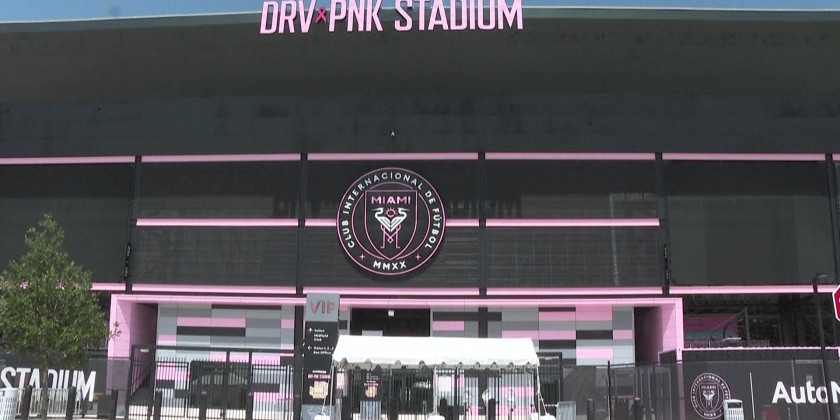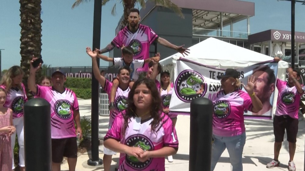 A dozen football superstar Lionel Messi fans chanting in front of the Inter Miami stadium and offices in Fort Lauderdale, braving the extreme Florida heat in the hopes to get a glimpse of the Argentinian player, as he arrives in Fort Lauderdale ahead of officializing his contract with the team.