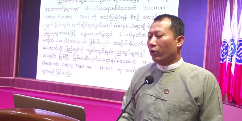 Next, Union Election Commission Member U Aung Moe Myint explained the purpose of inaugurating the MEVM Handling and Usage Training of Trainers Course and also presented cash assistance to the trainees. After that, Assistant Director U Ko Ko Maung from the Union Election Commission Office provided a detailed explanation and demonstration of the MEVM.