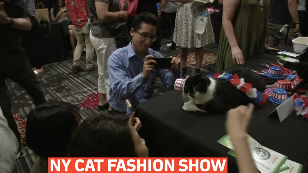 A literal catwalk took place in the lobby of the Algonquin Hotel in New York on Thursday. The legendary scene was filled with feline fashionistas. Some ten dressed up cats were entered into the annual fashion show to raise awareness for animal rescue and adoption. The year's theme was, "It's a Small World." The cats represented countries including Ireland, Spain, the United Kingdom and of course, the United States.
