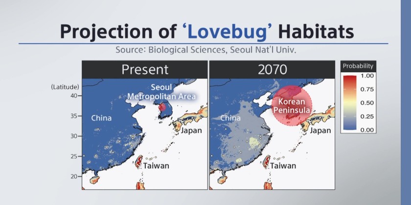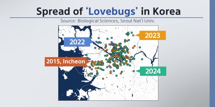 Love bugs normally live in subtropical climates. Since 2022, love bugs have been swarming in and around Seoul, South Korea, during June and July. While lovebugs don't pose a direct threat to humans, their sheer numbers and tendency to stick to surfaces have led to complaints from residents.