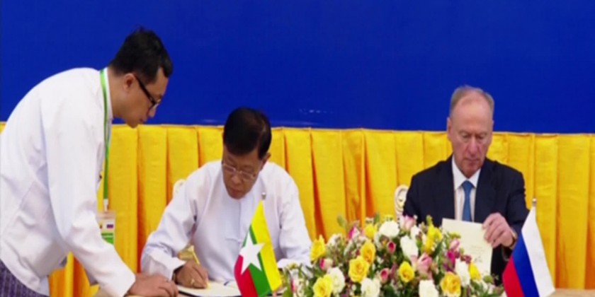 Next, the agreement on the cooperation of International Cyber Security sector between Myanmar and Russian Federation was signed by member of State Administration Council Deputy Prime Minister Union Minister for Transport and Communications General Mya Tun Oo and the secretary of the Security Council of Russian Federation Mr. Nikolai Platonovich Patrushev and exchanged memorable gifts and posed for the documentary photo.